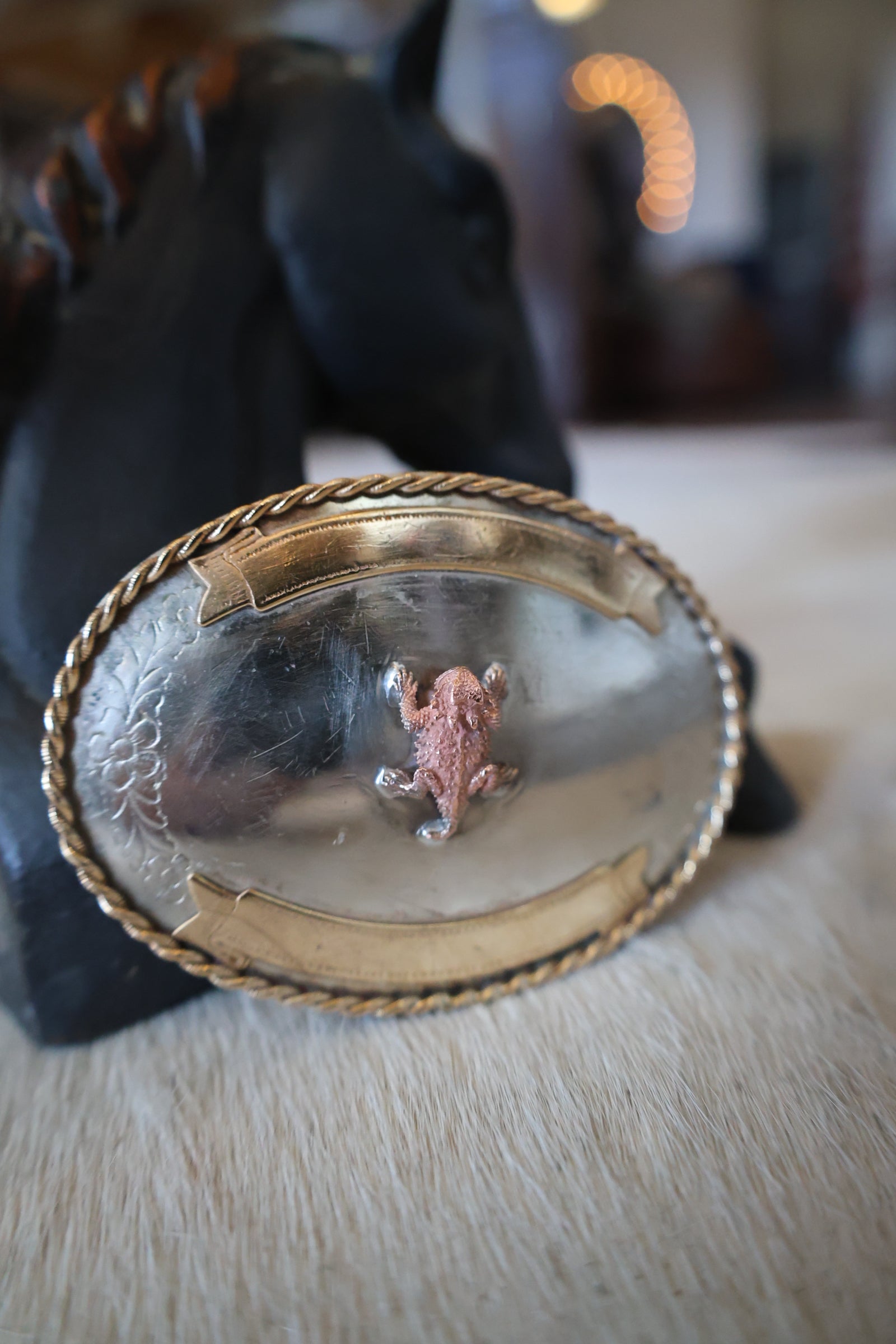CHIEFFALO americana's rebuilt vintage belt buckles. Are made with copper and brass molds for an elevated western flair. Certain buckles have been rebuilt with a hook and bar on the back.