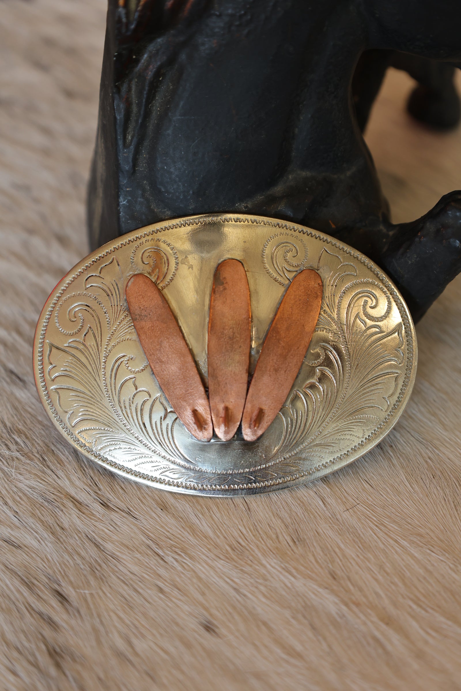 Vintage buckle with three of CHIEFFALO americana's new copper surf board mold added.