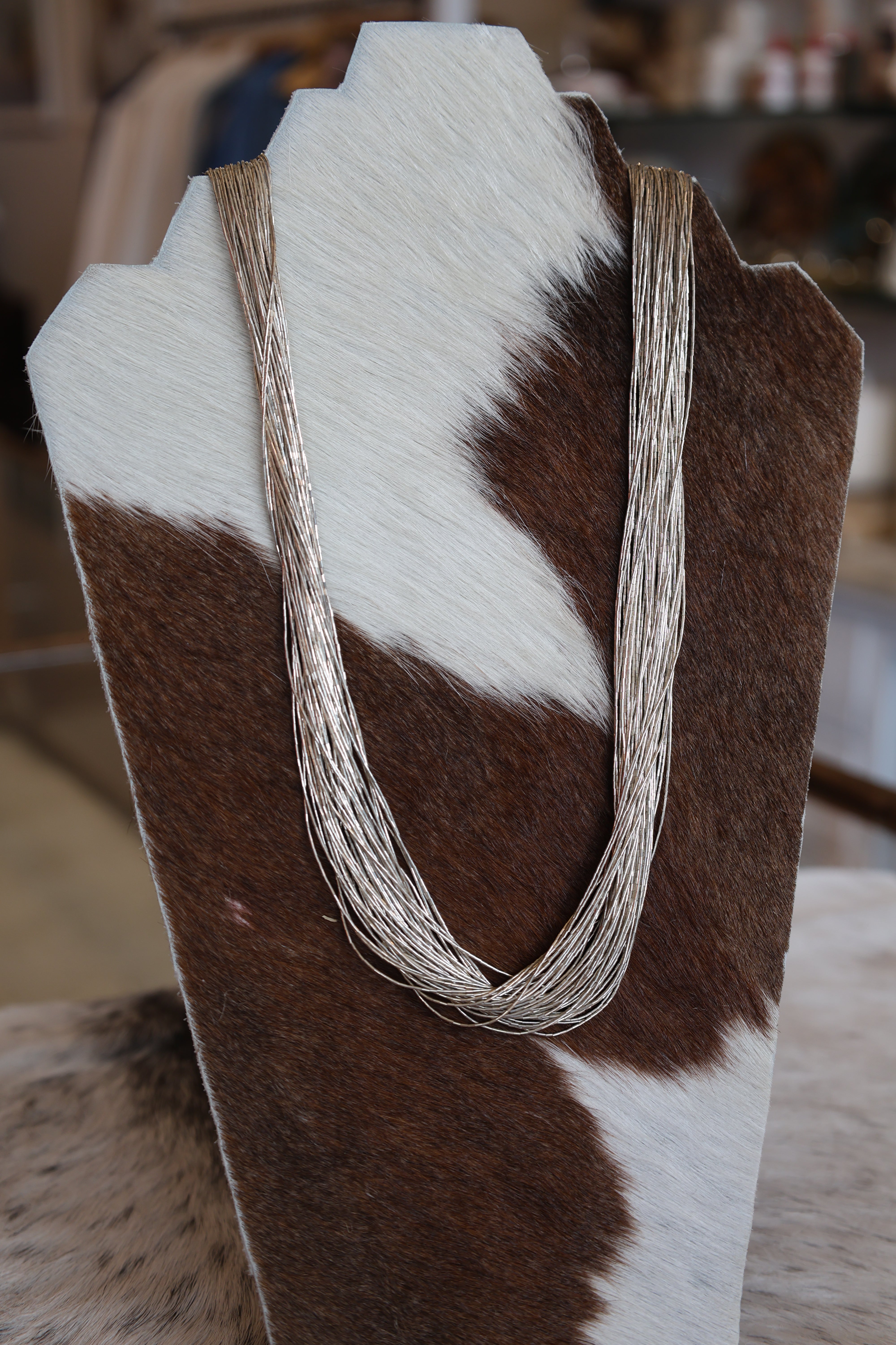 This is a fantastic vintage sterling silver Heishi liquid tube necklace. The necklace is about 29" long end to end and hangs from the neck about 10".
